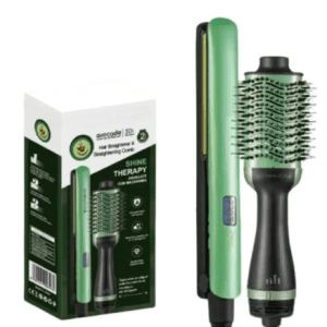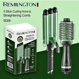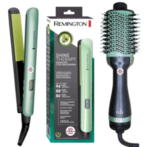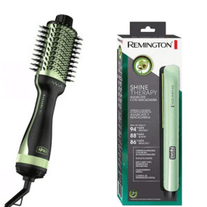 Combo para el cabello que incluye plancha Remington edición aguacate y cepillo secador de alto rendimiento. Ideal para alisar, dar volumen y proteger el cabello del calor.