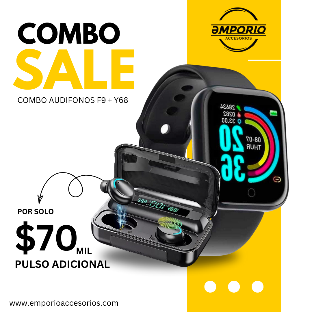 Haz más por ti con el combo perfecto de tecnología y estilo que solo Emporio Accesorios te puede ofrecer. Este set exclusivo incluye el Smartwatch Y68, ideal para monitorear tu salud, actividad física y recibir notificaciones desde tu celular, junto a los audífonos F9 Bluetooth, con caja cargadora tipo power bank, sonido estéreo HD y micrófono incorporado.