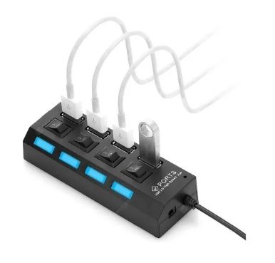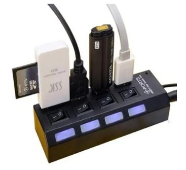 El Hub USB 4 Puertos 2.0 con Switch Individual y Luces LED es la solución práctica para quienes necesitan más conexiones en su PC o portátil. Diseñado para ofrecer organización, ahorro de energía y eficiencia, este dispositivo permite conectar hasta 4 periféricos al mismo tiempo, como mouse, teclado, memorias USB o ventiladores, cada uno con su propio botón de encendido y LED indicador.