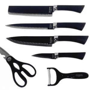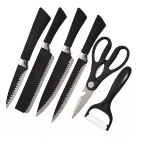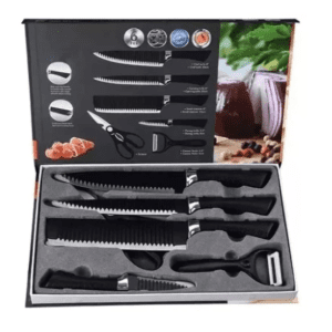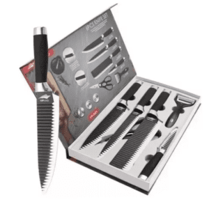 Set de cuchillos profesionales acanalados, ideal para cortar, picar y rebanar con precisión. Incluye 6 piezas multifunción con diseño elegante y filo duradero.