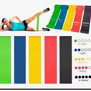 Set de 5 bandas elásticas de resistencia en colores y niveles variados. Perfectas para entrenamiento funcional, yoga, estiramientos, glúteos y tonificación.